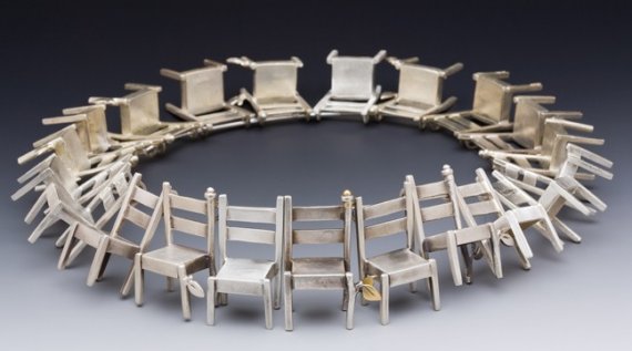 Rone’ Prinz’s work reminds me a lot of Thomas Mann (lots of bolted togther hearts and findings) though this unique necklace is very different from Mann’s work.