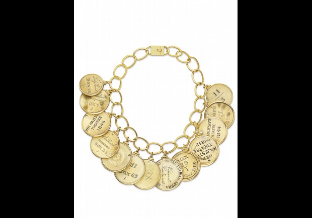I did like some of her caftans (I could see her rocking them with her turbans and 1970s Van Cleef and Bulgari jewelry). She had some pretty Chanel and Hermes bags. There were director’s chairs with her name on it, some of the bound scripts in violet leather engraved with gold lettering that had the name and date of the film on them. She had a Van Gogh, a Renoir, a lot of art nouveau pieces by Alphonse Mucha, Lalique…even a huge bronze cow statue that was done by her artist daughter Liza. Of course the Krupp/Elizabeth Taylor diamond was one of the most breathtaking gems I’ve ever seen.(I still think there’s a CZ copy she must have had secretly floating around somewhere) I loved the necklace that was willed to her by Edith Head of engraved opera discs. The very wealthyVictorians who had season tickets to the opera actually had round ivory discs that were their tickets, engraved with their names and the box number for the season. Edith Head had them each encased in a gold bezel and set on a beautiful large link chain. Elizabeth always admired it and Edith said when she died she would leave it to her in her will..and she did.
