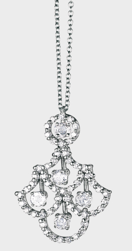 A chandelier pendant by Italian jeweller Damiani (with matching pieces, including earring). This is set with 1.26 carats of rose cut diamonds in 18k white gold. You can see more of the collection on the Damiani web site.