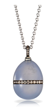 The pendant eggs come in different materials and prices. This one is made of blue chalcedony set with a line of brown diamonds set in blackened silver, with a matching diamond set bail. I am assuming the chain is sterling; the site does not specify. Yours for USD $8056 (a range of currencies is specified).