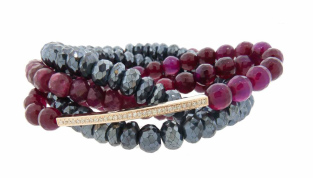 The Sydney Evan line became well-known for whimsical pendants and semi-precious bead bracelets (with Hamsas, evil eyes, wings) set with diamonds and other gems. Her pretty wrap bracelets are made with a mix of red stones and 14k rose gold set with diamonds. Available for USD $1410 from Ylang23.