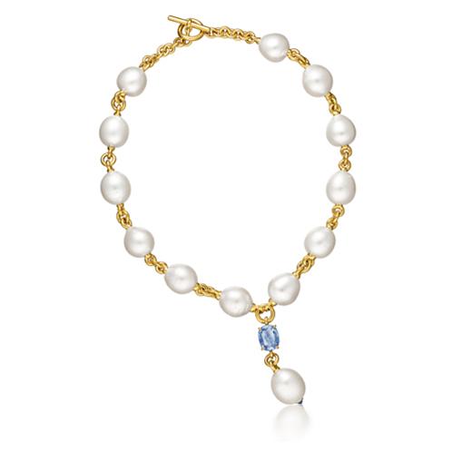 Originally designed in 1934, Fulco di Verdura’s Y necklace is made of yellow gold, South Sea pearls and a Ceylonese sapphire. Coco Chanel was often pictured wearing this with strands of longer pearl necklaces.