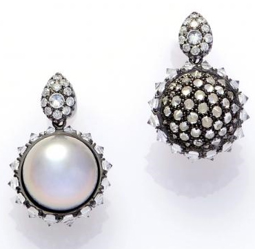 These bespoke earrings by Nicholas Liu have sparkle coming and going. Set with a pearl from the front, and pave diamonds and white sapphires from the back, they would look spectacular with an updo on a bride or for a special occasion. Giving them more versatility, the drops can be removed or worn with either the pearls or diamonds to the front.