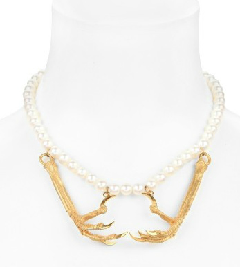 This pearl and yellow gold necklace, called The Thieving Magpie, echoes the Victorian fascination with taxidermy and the natural world, while also giving a witty nod to the magpie’s lust for all things shiny. Available from LuisaViaRoma for USD $2477.