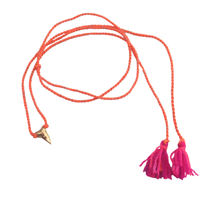 Her signature piece is woven Mexican cord with a shark’s tooth, here shown in 18k gold for USD $325 but also available in sterling silver for USD $95. She also recently launched a collection of brightly coloured woven bracelets in collaboration with jeans maker True Religion.