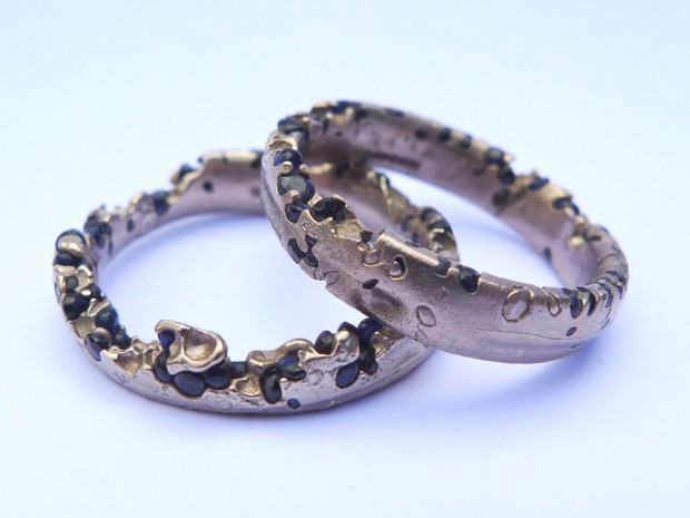 She describes her technique this way: Her current collections use a serendipitous approach to lost wax casting techniques married with the rich colours and beautiful cuts of fine gem stones. Polly uses sapphires and rubies directly cast into gold, creating pieces that resemble natural gem encrusted forms, like sparkling geodes split open, or discoveries from the deep. This unorthodox process is unique to Polly and has become her signature style, gaining her international recognition at major exhibitions and in craft and jewellery galleries. She is also selling in numerous stores in the UK and USA.