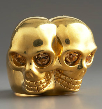 Now that I’ve harshed your mellow (and perhaps that’s a necessary requirement if you’re going to wear this jewellery), here is a double skull ring set with Swarovski crystals. Available from Bergdorf Goodman for USD $275.