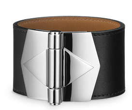 Hermes has some iconic jewelry designs – the collier de chien cuff, Kelly Dog and Chain d’Ancre bracelets and Farandole necklaces – and so a lot of their other designs get somewhat overlooked. This Bérénice cuff bracelet is made of chamonix leather (a matte finish) with palladium plated metal fastener. (They say silver and palladium on the site, but I don’t believe this is sterling with palladium plate.) As with a lot of Hermes jewellery designs, it can be worn by a man or a woman. Retailing on their site for USD $1,025.