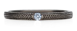 This simple black gold ring by DeBeers could be worn on its own, and would also look wonderful paired with other rings. Set with a tiny .03 diamond in textured gold, it is also available in white, pink and yellow gold. It sells for USD $750.