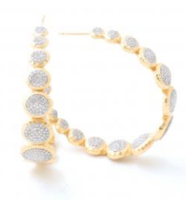 Inside outside diamond hoop earrings have been popular for a while now, mostly set with individual round diamonds. From Phillips Frankel, these are different and pretty, with round forms pave set with diamonds both in and outside the hoop. The hammered 14k finish also adds to the reflective surface. Total diamond weight is 1.45 ct. Available for USD $9500 from London Jewelers.