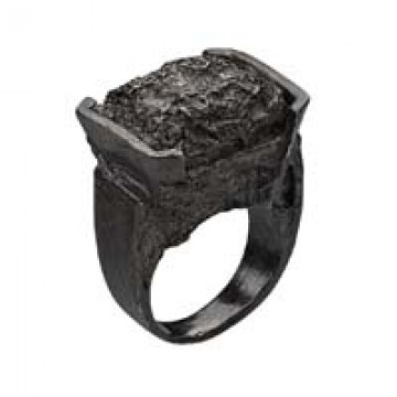 Offered here is a blackened brass ring with a molten top mimicking the look of a precious prong set stone. Basically, it says, “Don’t mess with me.” Available from the Azature