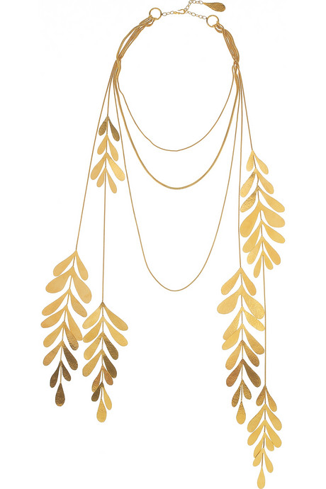 This necklace is so large and bold, it requires a very neutral backdrop to set it off. (Net-A-Porter shows it here with a draped gown whose neckline really complements the design.)