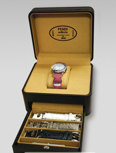 It comes with four different straps and its own storage case, and is USD $1225 from Neiman Marcus.