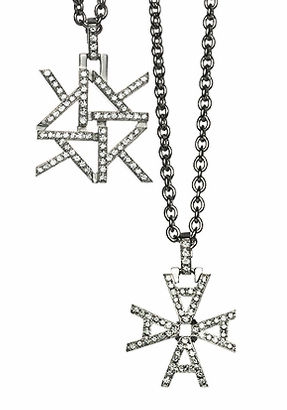 These pendants are a clever interpretation of the classic initial, here multiplied four times to great graphic effect. Hicks offers the designs in various forms (all silver, silver and diamonds, all gold, gold and diamonds). The silver and diamond version here sells for USD $1295 and is available at her online shop.