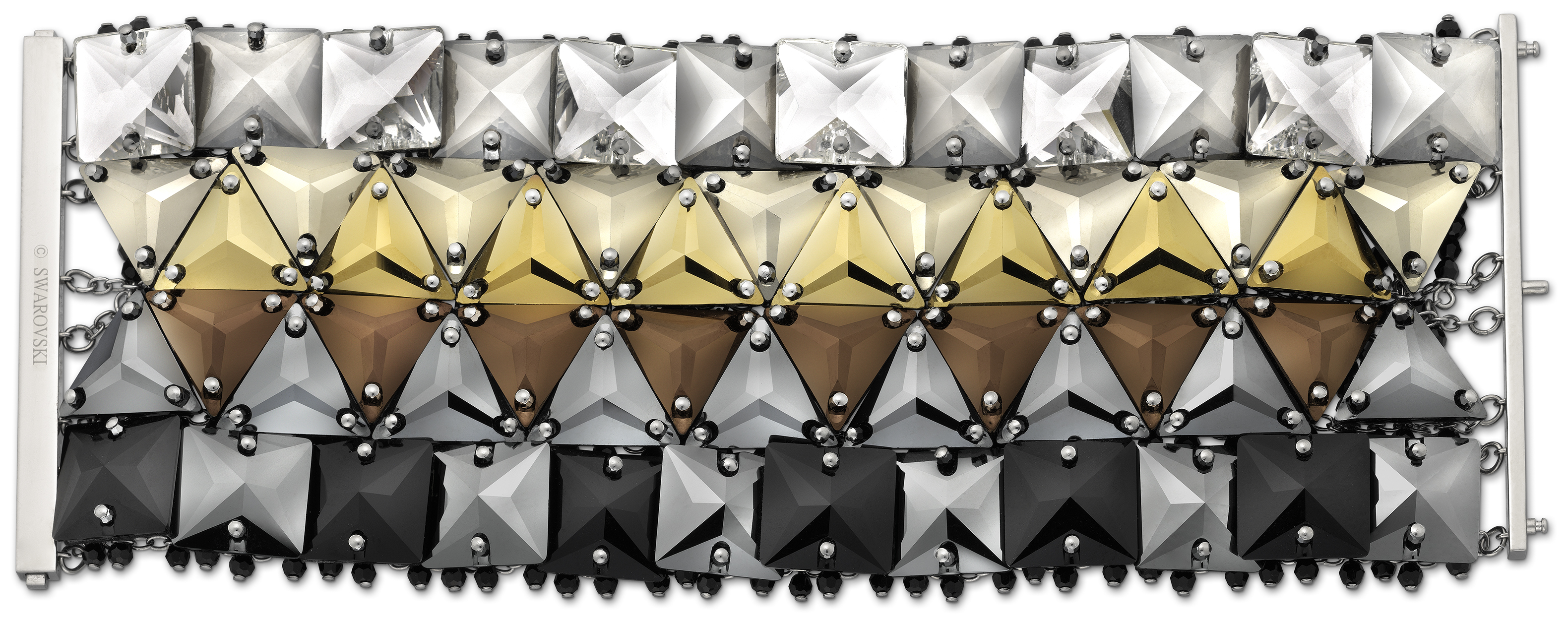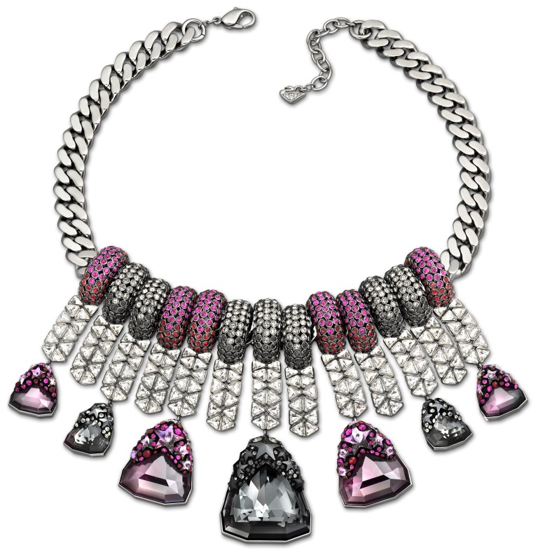 I had the pleasure of previewing Swarovski’s fall 2012 collection, themed “Kingdom of Jewels”. Expect baroque meets rock and roll: deep colours (plums, steel greys, reds, blues) with a lot of chain, studs, and pave work. There are also new collections for the Disney, small accessory, men’s and other standard Swarovksi groupings, all with the new theme.