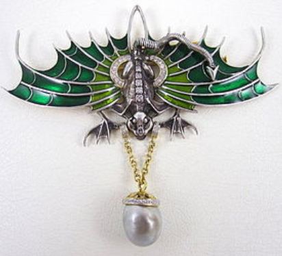 This sterling, 14k gold, enamel, diamond and pearl dragon pin is Nouveau in style, with a trombone clasp. Whether it’s vintage or not, it’s an extraordinary piece. Available for USD $3950.