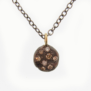 Coloured diamonds are very pretty but often out of reach price-wise. This sweet and small (1/4 of an inch) sterling silver necklace by Yasuko Azuma is set with eight round brilliant cut diamonds. The blackened metal of the sterling disc really sets them off nicely; comes with a 16 inch chain and is available from Palas Jewelers for USD $295.