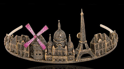 Parisian designer Lydia Courteille plays with flora, fauna, dreamy and sometime nightmarish figures and themes to create an otherworld of jewelled brilliance. Her Euro referential tiara plays with landmarks from several countries and is composed of black rhodium plated gold, black diamonds, rubies and pink sapphires. Price upon request.