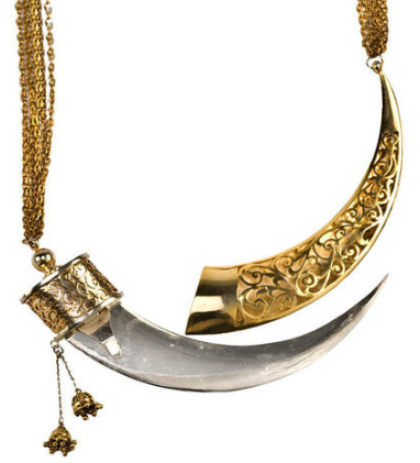 A very interesting and visible protest against domestic violence, especially coming as it does in jewellery meant to be worn on a wedding day. This necklace, which incoporporates the Sikh kirpan, or small dagger, also is meant to serve as a very visible statement.