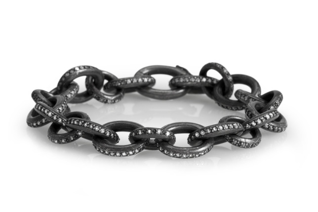 She sells solely in Southern California at the moment, at various stores. Her web site is pretty but there is no information as to prices or wider availability. Pity. Love this oxidized sterling silver link bracelet set with diamonds.