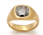San Francisco based designer April Higashi favours warm, buttery gold in solid forms, and sculptural lines. This 18k yellow gold signet ring is based on the old fashioned piece usually worn by men. Here, it is set with a 1.33 ct translucent black diamond. Price upon request from the artist.