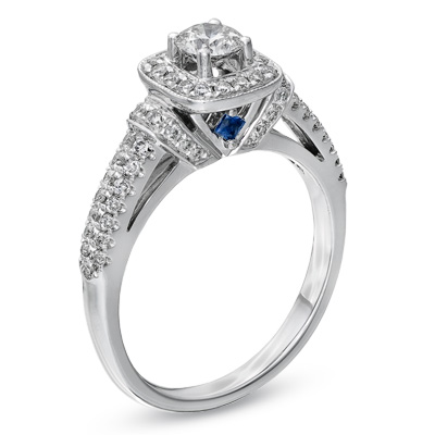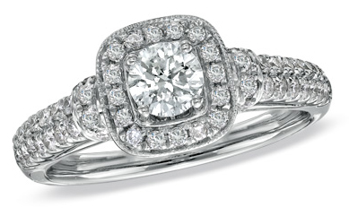 Recession or not, people are still getting married and wanting the nicest bling for their buck. Bridal gown designer Vera Wang is collaborating with mass jeweller Zales to offer a selection of rings pricesd at about $1999 to close to $10000. I wanted to see what you could get at the lower end and here is this pretty engagement ring. Centre stone is about .30 points, surrounded by a halo of pave diamonds. Total carat weight is about .75, with two princess cut sapphires on the sides of the mounting, which is 14k gold. Pretty for the price.