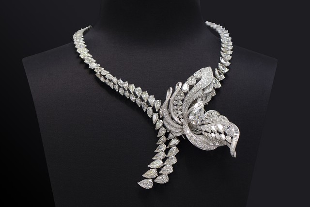 The collection was designed by Hollie Bonneville-Barden. Prices range from 269,500 euros for a pair of earrings with 5 carats of diamonds to 4,485,000 euros for a brooch with a 16.38-carat diamond. All are one-of-a-kind pieces.