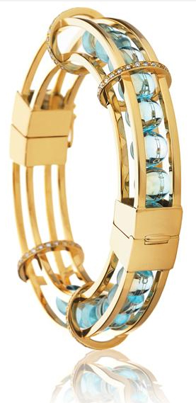When an online jewellery group to which I belong was discussing Yael Sonia’s work, I went back to have a look (having featured her earrings last year). The major criticism, they concluded, is that it would be difficult to wear. While I can see that is probably likely, this 14k bracelet with freely moving quartz beads does have its appeal. It sells for USD $35,000 on the designers site, as well as at retail locations.