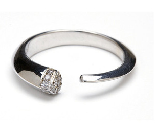 Keiden’s Horn ring has the same basic design without the scary (and potentially lethal to fabric) sharpness. I like the more muted shape, and the diamond accent. And the price, given the way gold and diamonds are going these days, is also reasonable, at USD $1150. Keiden, who has a background in visual studies, has also ventured into things like awards design (The Streamy Awards, for web television), hand painted limited edition wallpaper, and a collection of jewelry for Eve Ensler’s organization http://www.vday.org. She has also had paintings exhibited at a show benefitting the Andre Agassis Foundation. Keiden also takes commisions for custom work, exemplars of which can be seen on her site.
