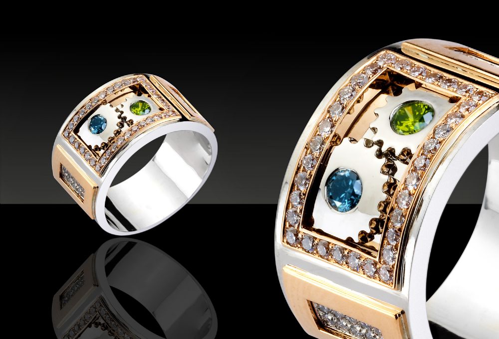 The Time collection plays on the wheels and cogs found in watches; the ring below has a total diamond carat weight of .77, set in 18k white and rose gold. For more information, see the Novo Hombre web site.