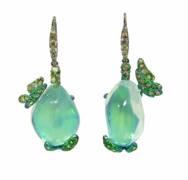 I am a total sucker for opals – I love the form of the gem, a gel matrix, and the colour play you get in the best stones. These luscious earrings are set with 20.71 carats of opals, set in green titanium and blackened gold, accented with tsavorite and diamond butterflies. The one of a kind pair sold by Arunashi for USD $9,880 at Ylang23.