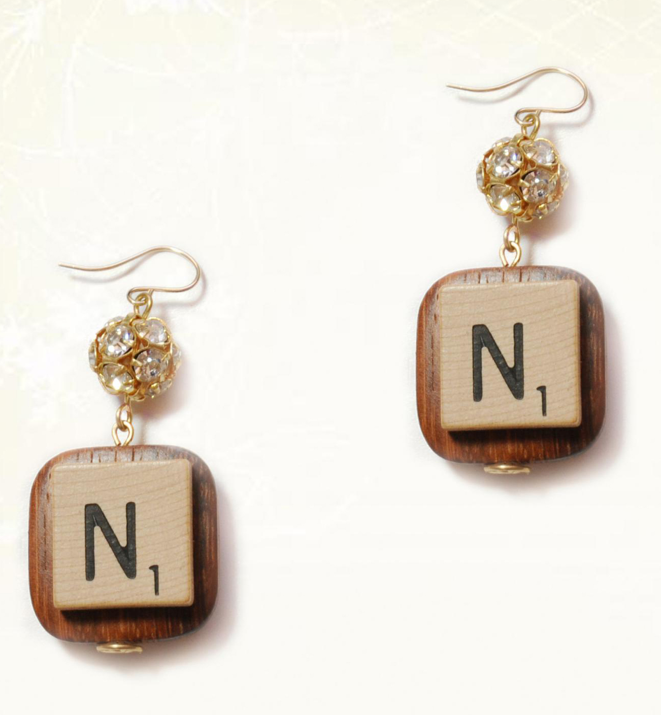 I have seen a lot of bracelets made with vintage mah jong tiles, and items crafted from old typewriter keys but I think this is the first time I have seen Scrabble pieces used in jewellery. Lenora Dame offers these cute drop earrings with your choice of letter/tile for USD $40. A fun and personalized gift!