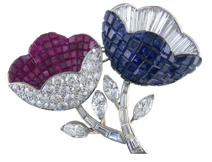 This platinum, sapphire, ruby and diamond twin flower brooch has the following specs: 4 marquise diamonds 1.87 cts.; 17 tapered baguette diamonds 3.46 cts.; 4 baguette diamonds 0.48 cts. ; 3 step cut trapezoid diamonds 0.62 cts.; 26 round diamonds 2.95 cts.; 64 square sapphires 19.58 cts.; 67 square rubies 13.09 cts.