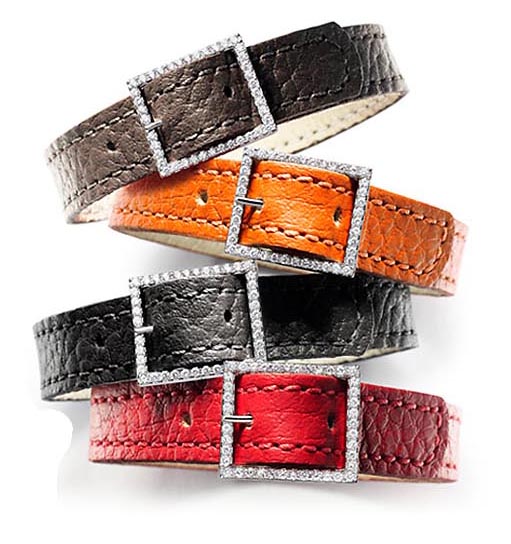 This is a pretty and presumably affordable way to wear a few stacks of blingy bracelets. Crislu, known for their cubic zirconia jewellery, offers these leather bracelet with CZs set in sterling silver and plated in platinum. Price is not available on their web site but retailers are listed.
