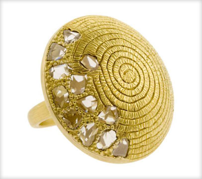 Coomi works in 20k gold, giving the pieces a lush, buttery look. This ring, part of the Eternity collection is set with rose cut diamonds. US retailers for Coomi can be found on their web site.
