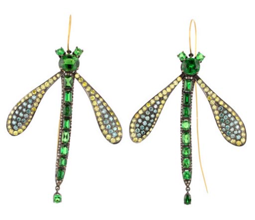 Made of tsavorite, blue, yellow and cognac diamonds, these dragonflies by Michael Tracy can take wing on your ears for USD $75,ooo. Available from Stanley Korshak.