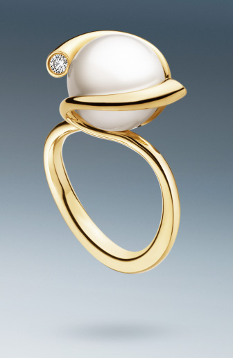 The sinuous way a gold strand wraps around and secures this 10.5 mm freshwater pearl is indeed magic. Made with 18k yellow gold and set with two diamonds totalling .08 carats, this ring is designed for Georg Jensen by Regitze Overgaard. There are several other pieces in the Magic collection, including bands that can be mixed to form a more personalized design. This sells for USD $1,850.