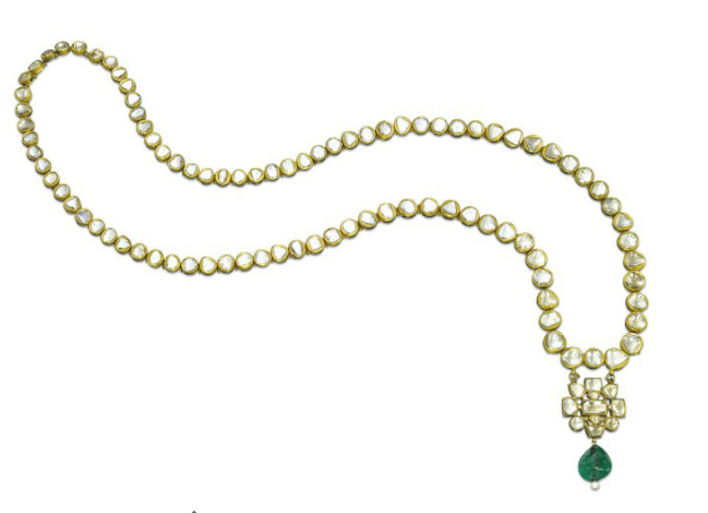 Auctioned November 13 in Geneva by Christies, the piece is composed of graduated circular gold collets, each set with a table-cut diamond and applied with green enamel on the side and reverse, to the later added similar cluster pendant suspending an emerald drop and pearl terminal.