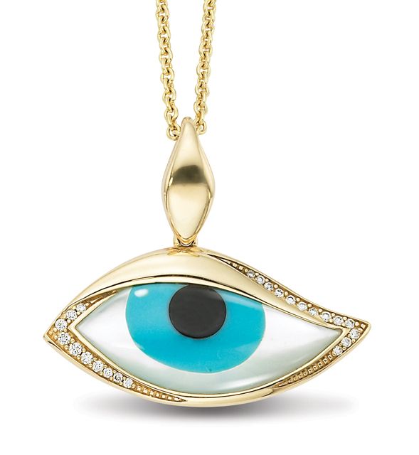 By American jewellers Kabana, it’s part of their Mati collection. There are several designs; this one is inlaid with white mother of pearl, turquoise and onyx, set in 14k yellow gold and accented with diamonds. Total diamond weight diamonds is .10ct, SI1, quality G-H color. No price is indicated but there is a retailer list on their web site.