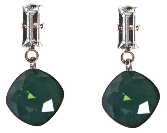 These charming earrings are made of brass and crystal, and have a sweet old world look to them. They are made of crystals set into brass findings, and there is also a matching necklace with graduated green glass beads. These earrings sell for USD $150.