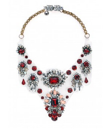 But reading the description, I realized it is Swarovski crystals attacked to a clear PVC bib, which then fastens with a chain. Designer Shourouk has taken what could have been a fairly heavy and rather formal evening piece and added a witty element that will make it appear that the jewels are floating, and turns it into a great day wear piece. Available soon for 500€ .