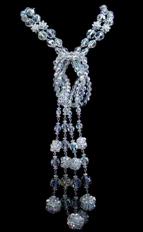 Gustave Sherman did many multi-strand necklaces that played it safe, but every once in a while, he produced a design like this one, that looks as fresh and contemporary today as it did when it was introduced, likely in the late 1960s or early 1970s. Sherman worked only with Swarovski crystals and this lariat uses clear and aurora borealis finished beads, as well as making studded beads by combining different sizes (seen in the tassels on the end). The fact that this was wired together instead of using linen or fibre thread also means it has lasted beautifully.