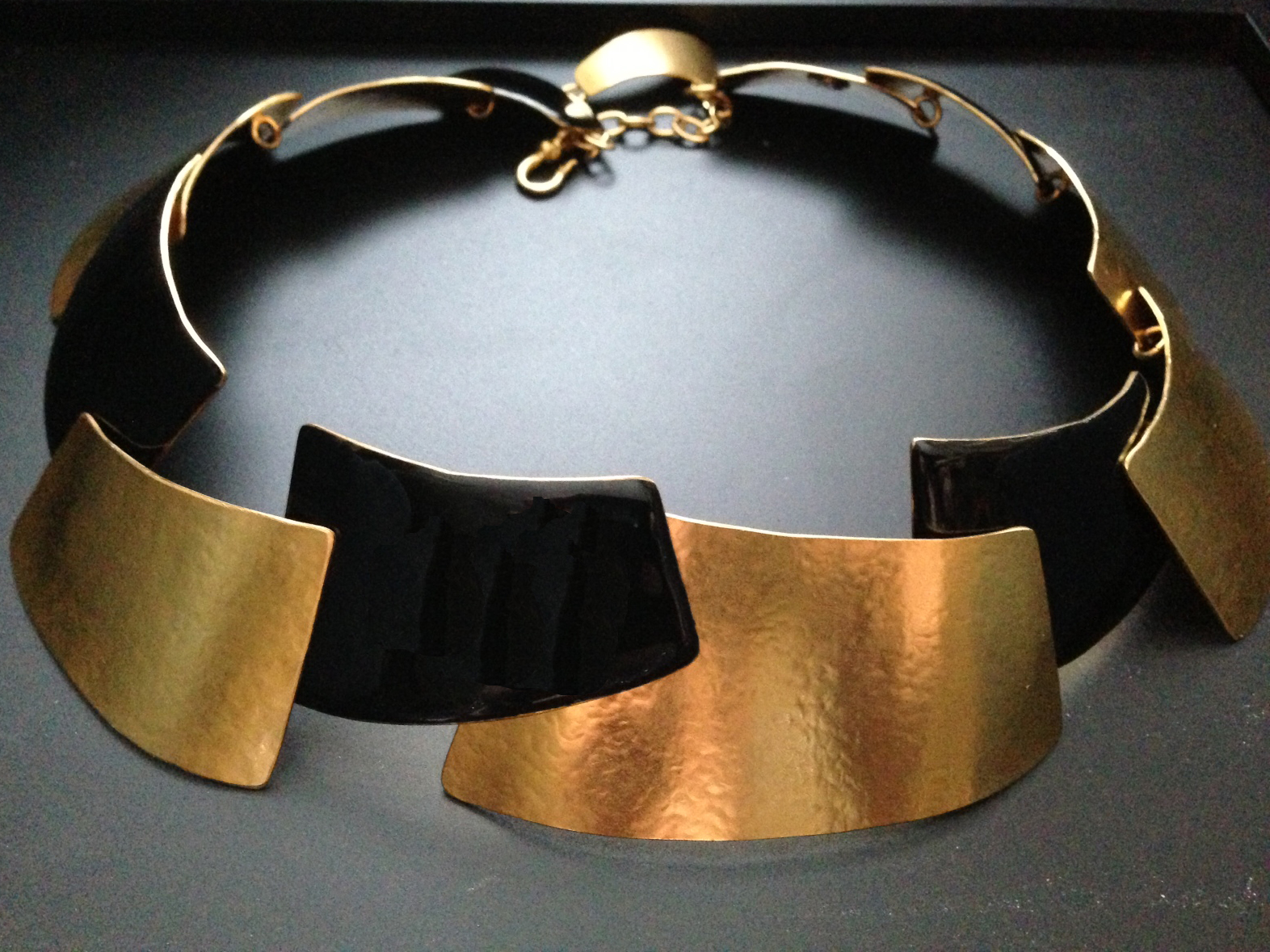 I was very pleased to come across this hinged necklace, made with gold plated and hammered brass off set by black enamel. It sits high and slightly outward, a bit like a formal collar. My pleasure deepened when I was able to obtain it for a fraction of its original $980 price, as the store is (sadly) no longer carrying his line. Their loss, my gain.