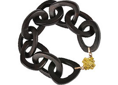 I like the oversized links and organic look of this ebony bracelet by Clara Williams. I’m not as fond of the lack of information on the web site – for example, no details on what the clasp may be made of. Gold plated sterling? Gold? Brass? Bronze?