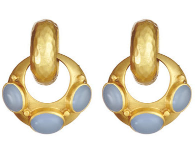 First, the good news. They are very pretty, and available in the chalcedony blue shown, something designer Julie Vos is calling aqua chalcedony, moonstone, turquoise or labradorite. The stones are set in a very elegant hammered and polished gold setting.