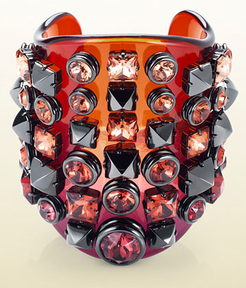 I think what I like most about this Gucci piece is its sheer chutzpah. Given the price (got USD $2690 to spare), the materials (Plexiglas and rhinestones set in brass, the heavy 80s borrowing that can probably be had at your local vintage shop, the in your face colour, it’s got a wealth of sheer gall going for it. (Well, and the fact that 80s is now considered vintage. I weep.)