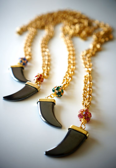 This piece is made with an Italian horn charm, rhinestone beads and comes on a gold plated chain. I have a soft spot for horn pieces and the horn shape since seeing Diana Vreeland’s gigantic horn necklace, something she was rarely seen without in her later years. This is a very reasonable $35.49 on the designer’s site.