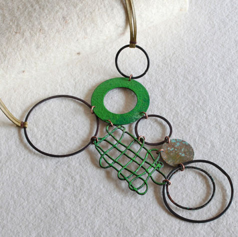 Montserrat Lacomba, designing under the name Mar de Color Rosa and selling on Etsy, offers a line of fun and sleek designs. Here, a one of a kind piece made of oxidized brass and oxidized and enameled copper. It sells for a very reasonable USD $53.42 through his shop.