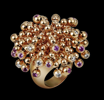 Nouvelle Vague was the 1960s new wave of individualistic film making, though I’m not sure if that’s Cartier’s intent. They do describe this ring this way: A free-thinking aesthetic that speak volumes. Delicate, articulated spheres of gold, speckled with diamonds or pink sapphires. A celebratory, extravagant allure that sparkles with grace.