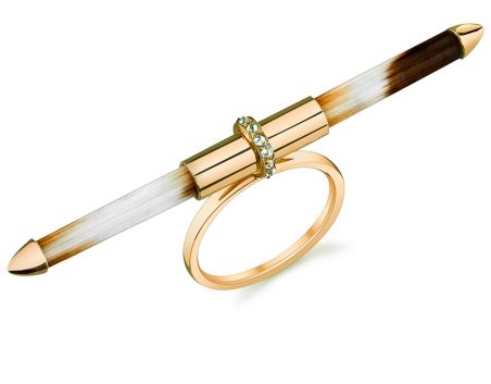 The design for this Protection Ring by Daniela Villegas is kind of cool. Alas, as there are scant details on the Roseark site where it is being sold, I am guessing it is an actual porcupine quill, tipped with gold (carat content unknown or at least unstated), with a diamond set band set in the centre.